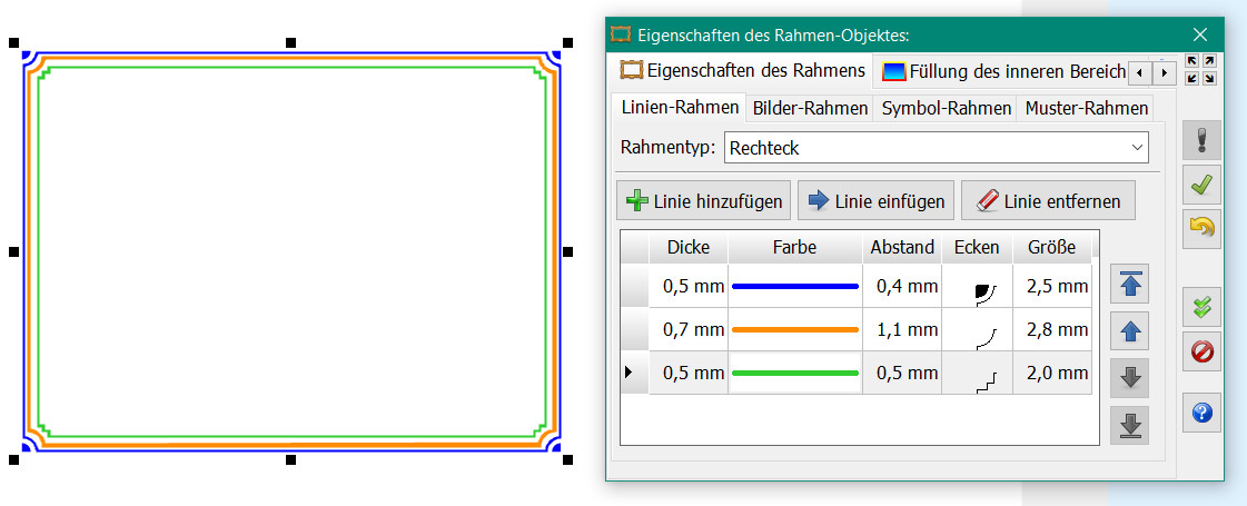 Ein Linien-Rahmen kann aus mehreren, unterschiedlich breiten und farbigen Linien bestehen. Bei jeder Linie kann zusätzlich ein Abstand zur nächsten, inneren Linie angegeben werden. Ebenfalls können unterschiedliche Ecken ausgewählt werden. Durch die Kombination von Linien mit unterschiedlicher Ecken ergeben sich interessante Effekte.