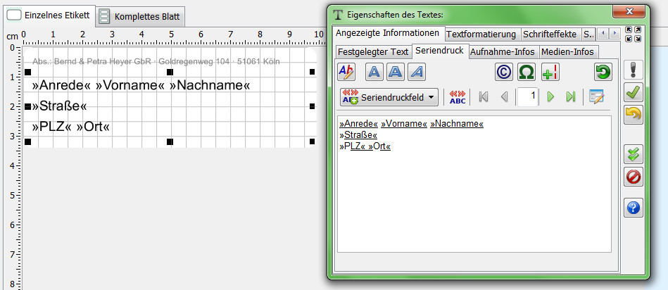 Ist eine Seriendruck-Datenquelle vorhanden, so können im Text-Objekt die vorhanden Felder als Platzhalter (Seriendruckfelder) angegeben werden. Diese werden dann beim Seriendruck durch die entsprechenden Informationen aus der Datenquelle ersetzt.