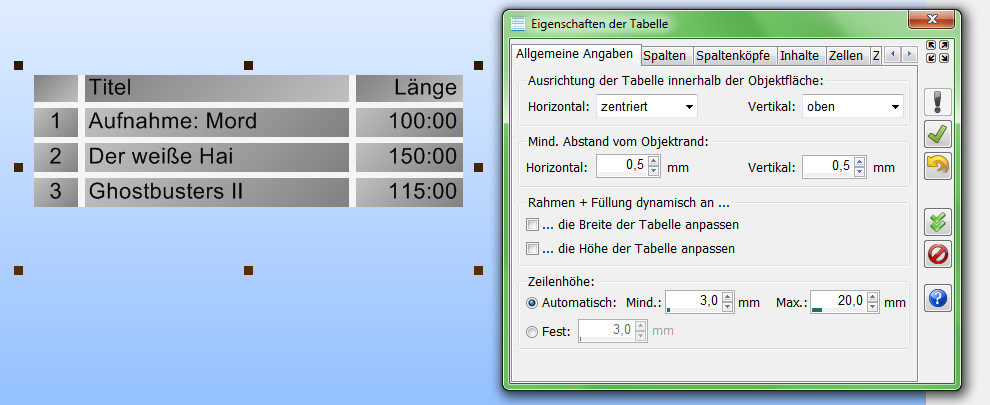 Mit dieser Feldart, können Informationen tabellarische ausgegeben werden. Es können sowohl feste Text eingegeben werden, wie auch auf die Aufnahme-Informationen zurückgegriffen werden, die durch Heyer's Etiketten-Studio in separaten Dateien verwaltet werden.